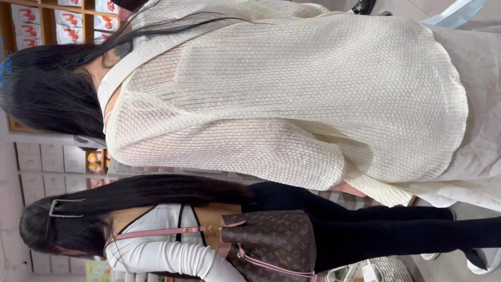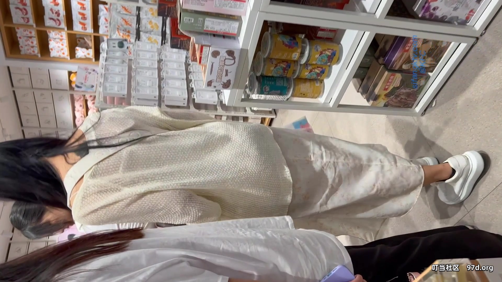 商城尾随两个买水杯时尚小迷妹 透过带血窄内看到肥凸的阴部轮廓